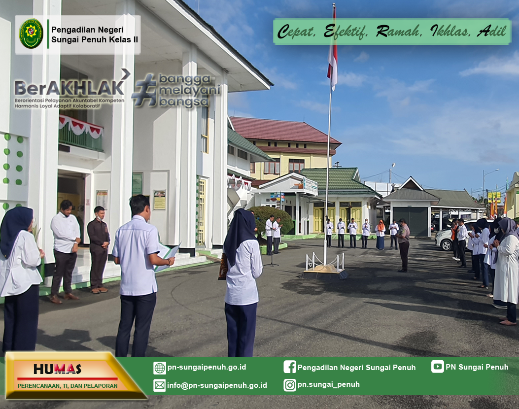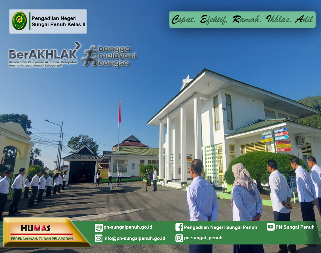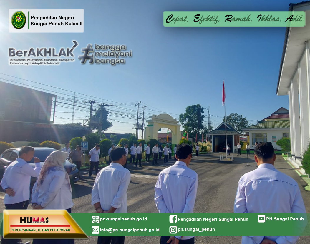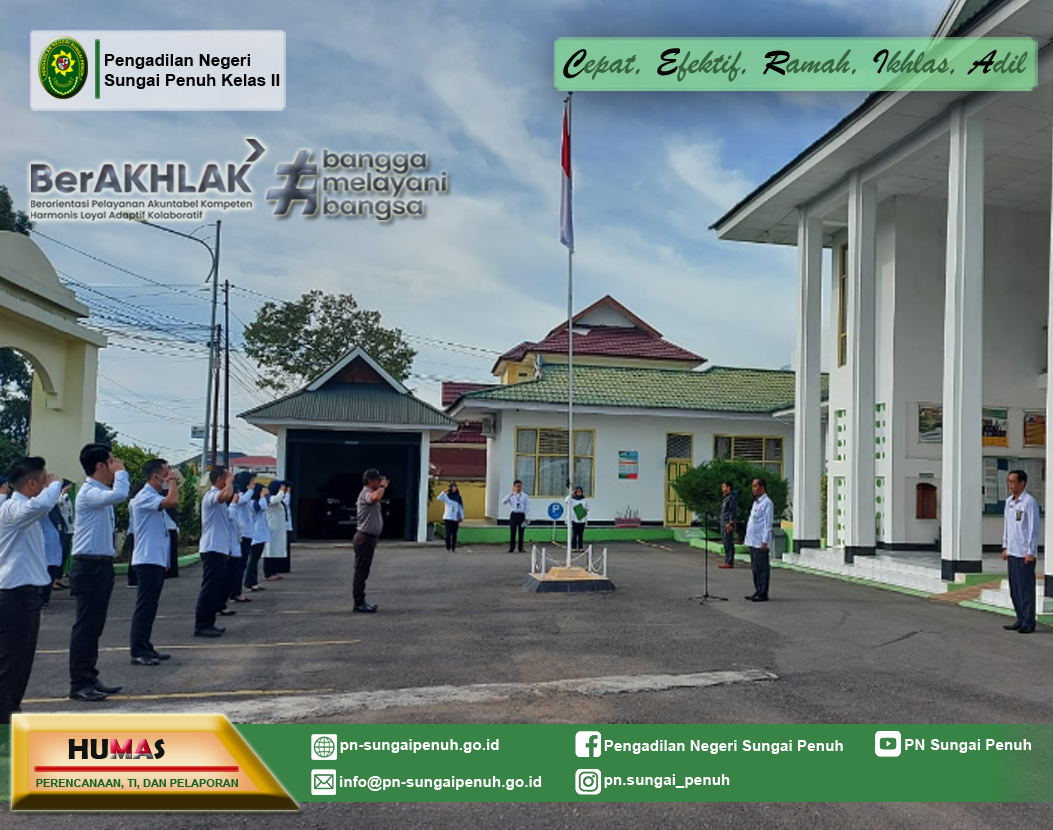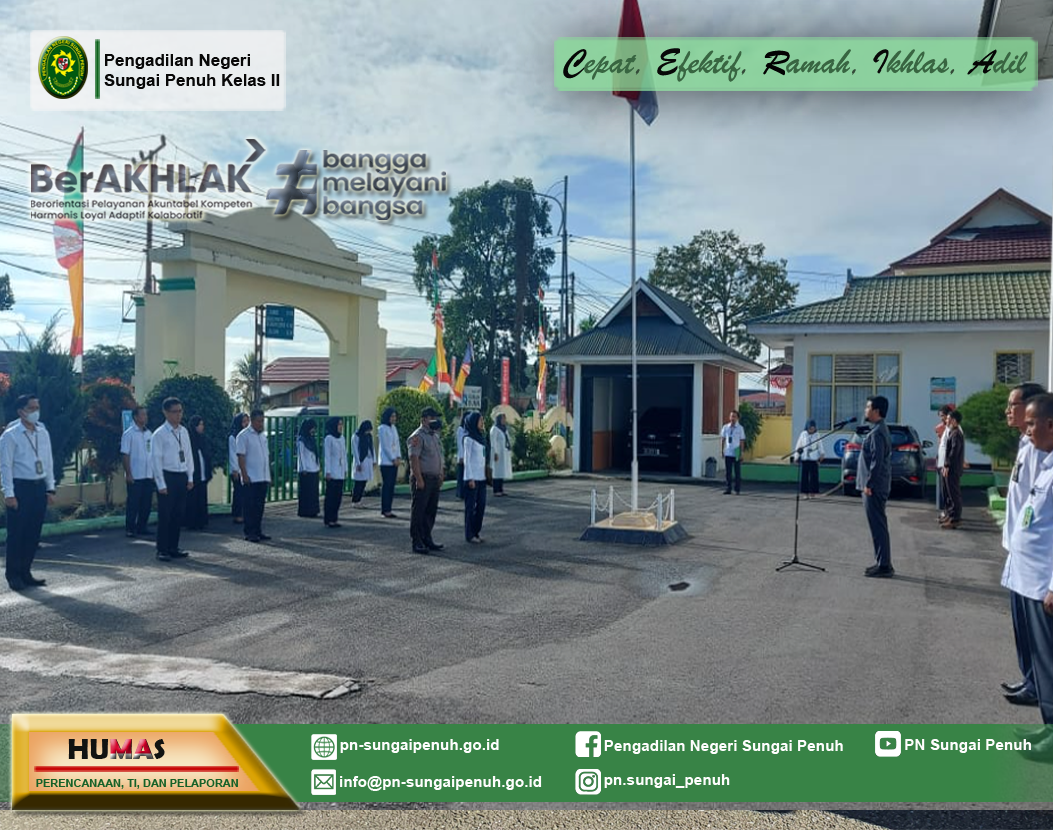 Pelaksanaan apel rutin pada Pengadilan Negeri Sungai Penuh pagi ini dipimpin oleh Ketua Pengadilan Negeri Sungai Penuh, Bapak Eka Prasetya Budi Dharma, S.H., M.H.