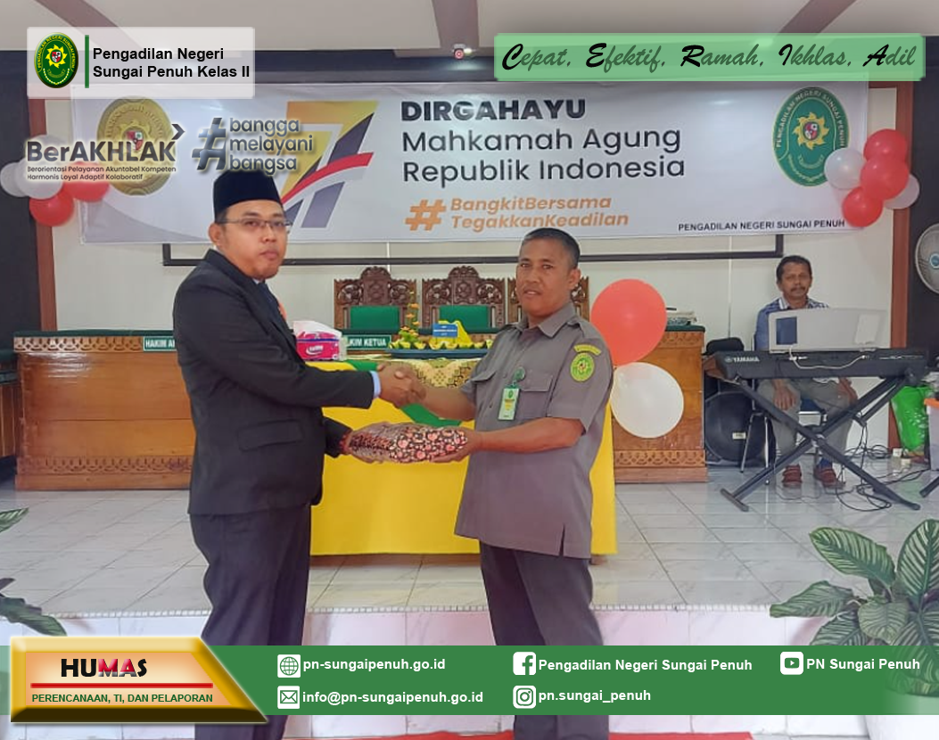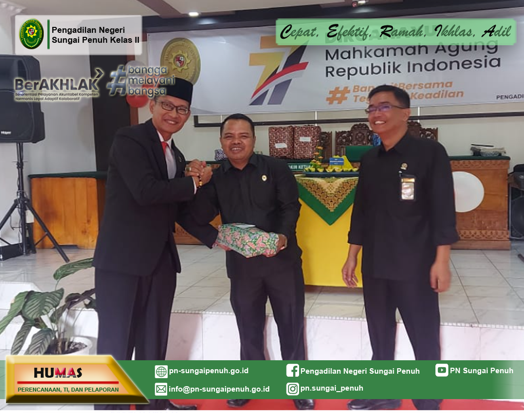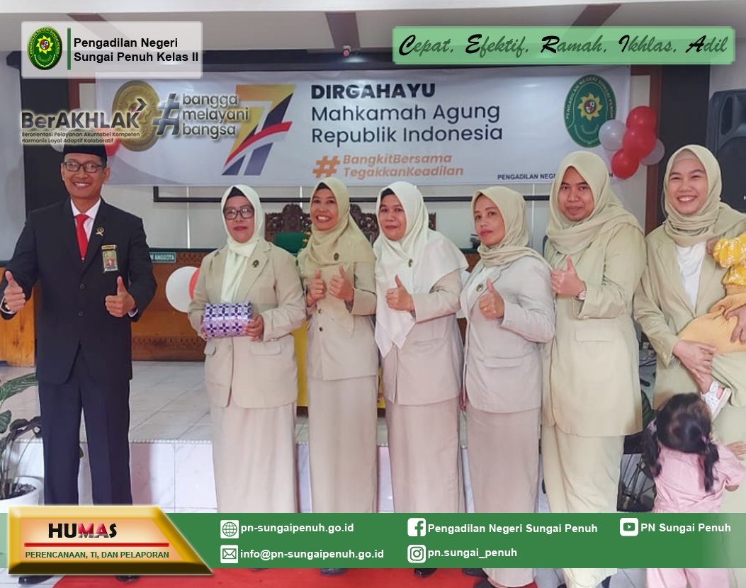 Bertempat di Pengadilan Negeri Sungai Penuh telah dilaksanakan upacara Perayaan Ulang Tahun Mahkamah Agung Republik Indonesia yang ke-77. Upacara diikuti tidak hanya oleh seluruh Hakim dan Pegawai Pengadilan Negeri Sungai Penuh, tapi juga oleh seluruh Hakim dan Pegawai Pengadilan Agama Sungai Penuh beserta Dharma Yukti Karini (DYK) Cabang Kota Sungai Penuh.