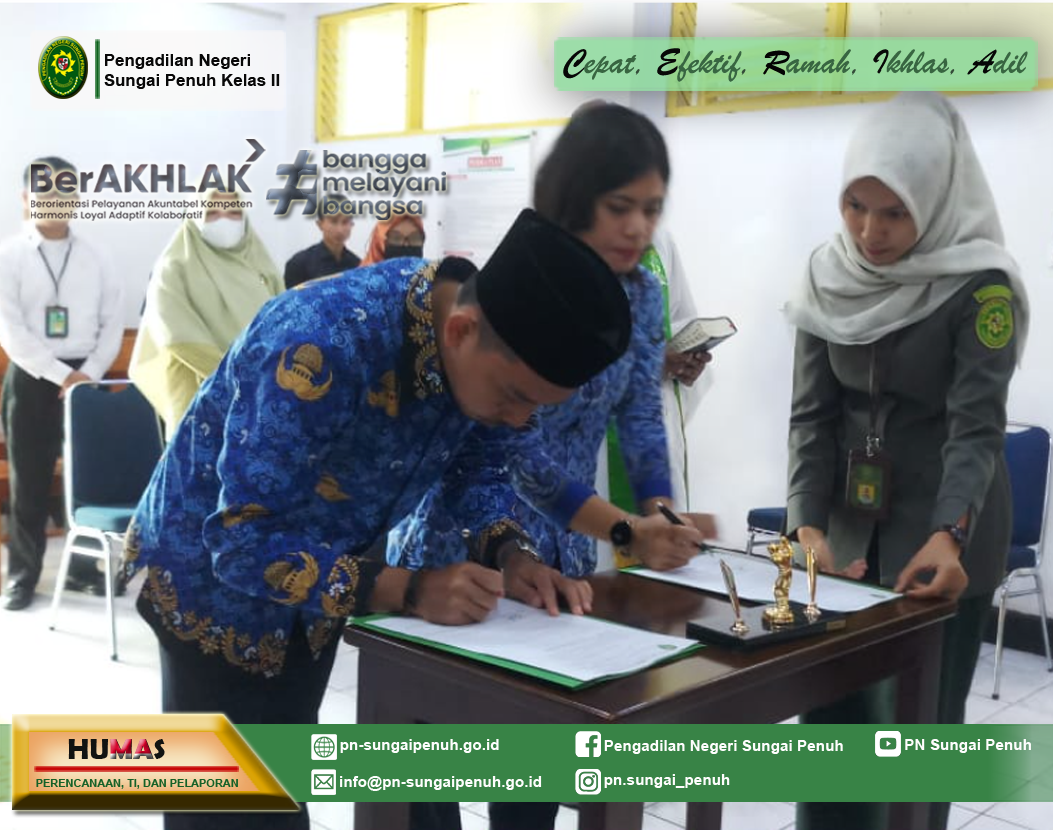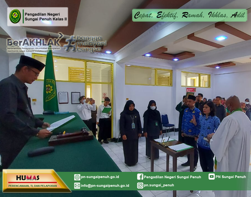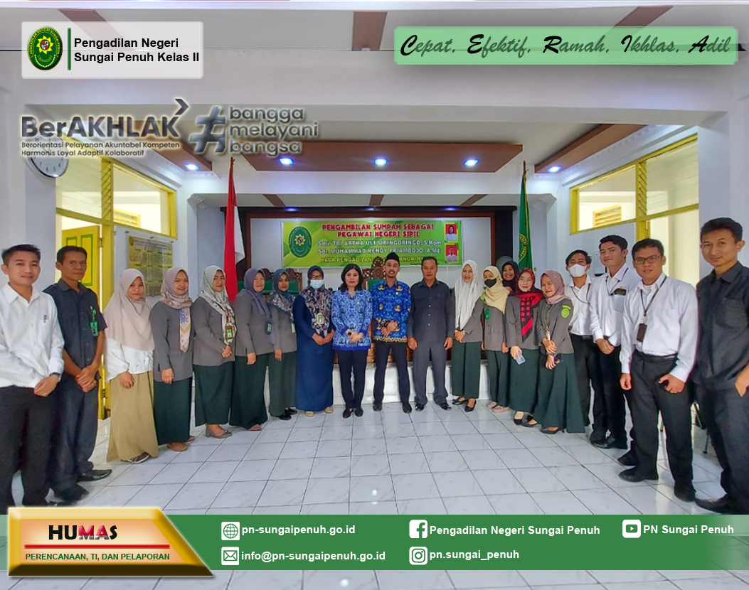 Bertempat di Ruang Sidang Pengadilan Negeri Sungai Penuh telah dilaksanakan Pelantikan dan Pengambilan Sumpah Pegawai Negeri Sipil (PNS) kepada Tri Artha Uli Siringoringo, S.Kom. dan Rendy Priambodo, A.Md. setelah melewati masa percobaan selama 1 (satu) tahun 7 bulan sebagai Calon Pegawai Negeri Sipil (CPNS).