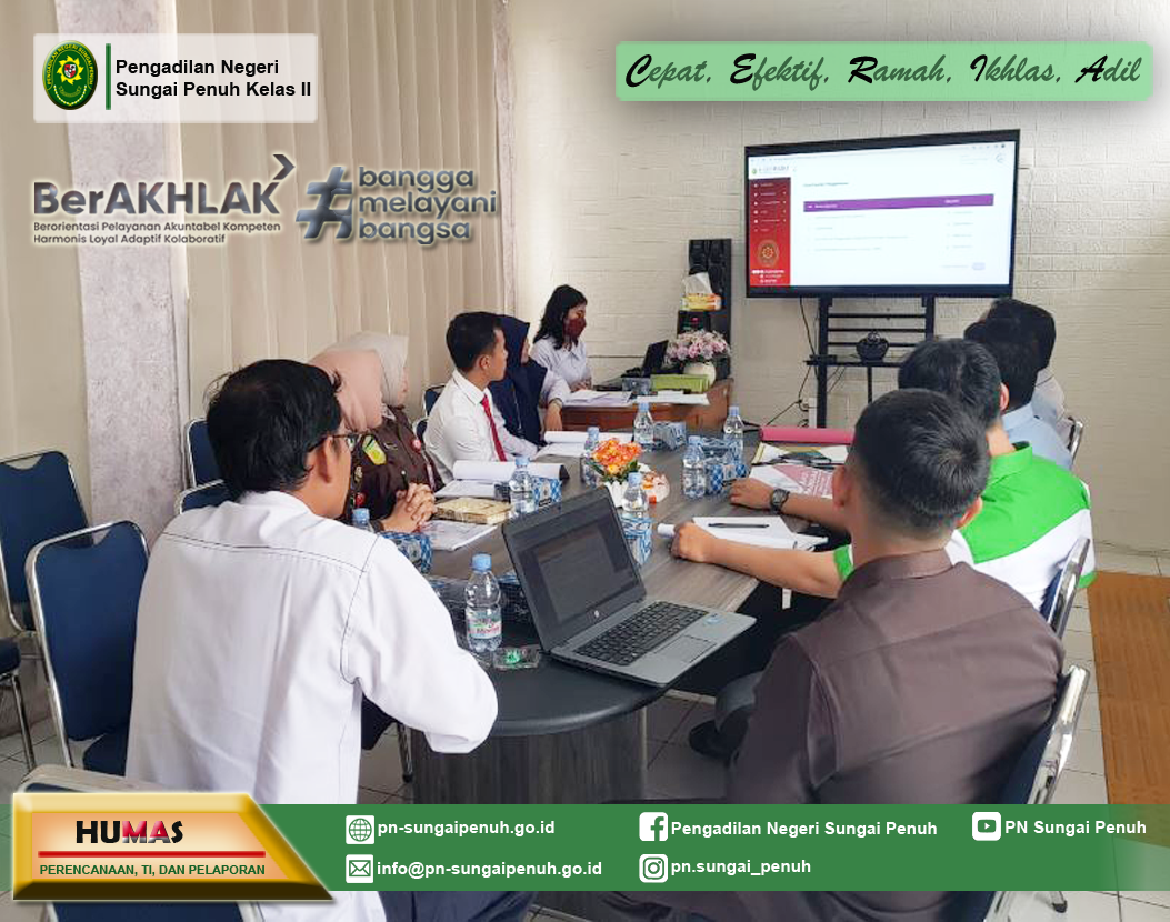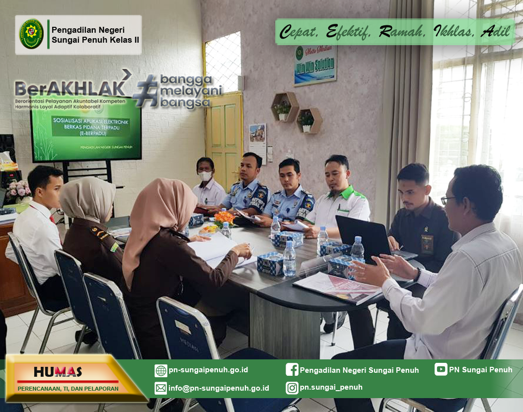 Pengadilan Negeri Sungai Penuh mengadakan sosialisasi aplikasi e-BERPADU (Elektronik Berkas Pidana Terpadu) dengan mengundang Kejaksaan Negeri Sungai Penuh, Kepolisian Resor Kerinci, dan Rumah Tahanan Negara Kelas II B Sungai Penuh selaku Aparatur Penegak Hukum wilayah hukum Kota Sungai Penuh dan Kabupaten Kerinci. Sosialisasi ini merupakan tindaklanjut dari sosialisasi aplikasi e-BERPADU yang telah diselenggarakan Biro Hukum & Humas Mahkamah Agung RI. Kegiatan tersebut bertempat di Ruang Command Center Pengadilan Negeri Sungai Penuh.