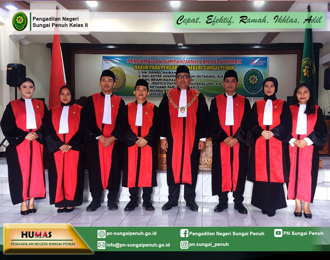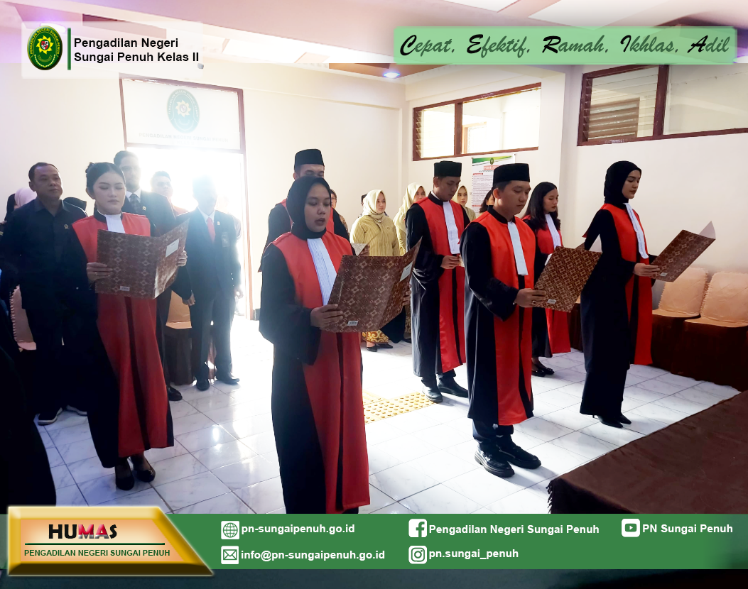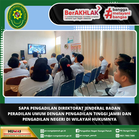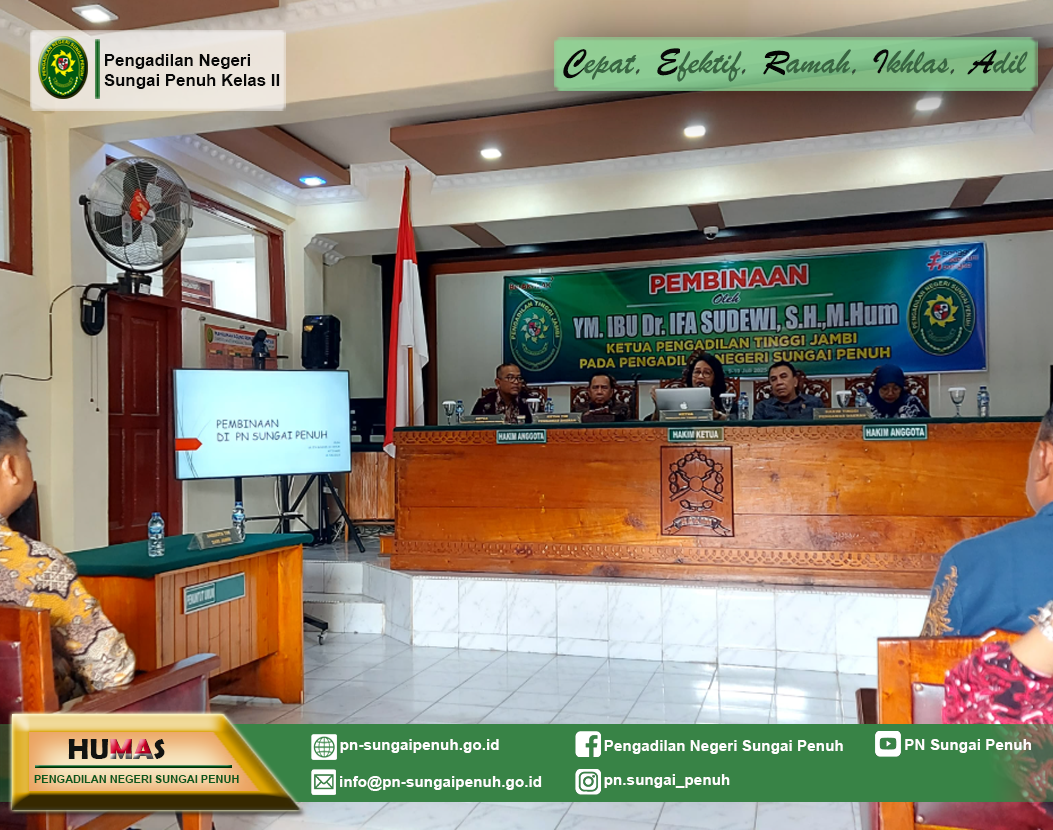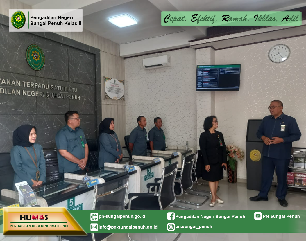Telah dilaksanakan Asesmen Sertifikasi Mutu Pengadilan Unggul dan Tangguh (AMPUH) dan Pengawasan Daerah terhadap Pengadilan Negeri Sungai Penuh oleh Tim dari Pengadilan Tinggi Jambi, dengan pelaksanaan asesmen AMPUH yang dipimpin oleh Bapak Abu Hanifah, S.H., M.H. serta Pengawasan Daerah yang dipimpin oleh Ibu Retno Murni Susanti, S.H., M.H. Pelaksanaan kegiatan tersebut merupakan bagian dari monitoring rutin terhadap Pengadilan dalam mendorong peningkatan kompetensi dan integritas tenaga teknis, tertib administrasi perkara, dan manajemen pelayanan di Lingkungan Peradilan Umum.