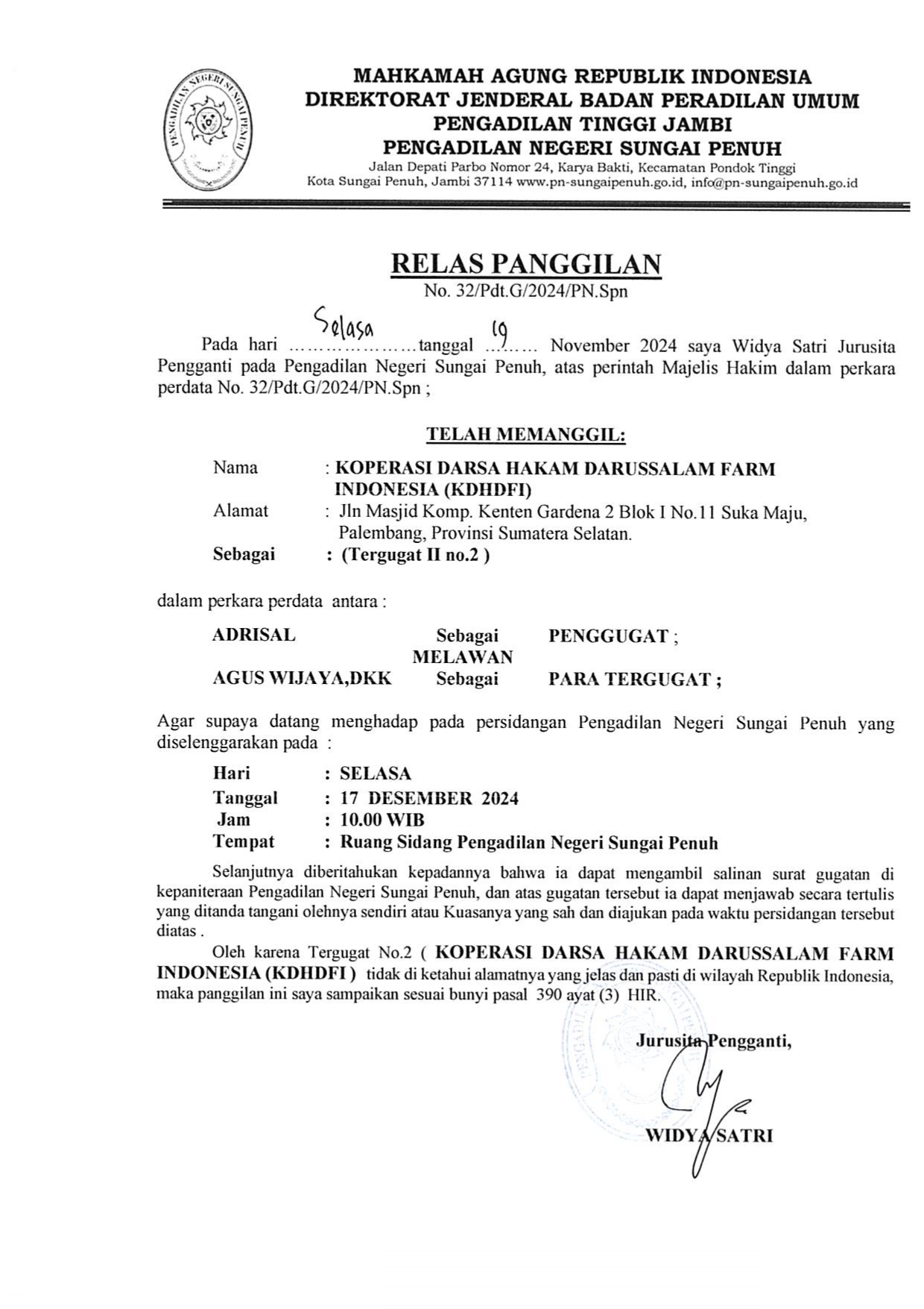 Untuk menghadap di persidangan pada hari Selasa tanggal 17 Desember 2024 pukul 10.00 WIB di Pengadilan Negeri Sungai Penuh |