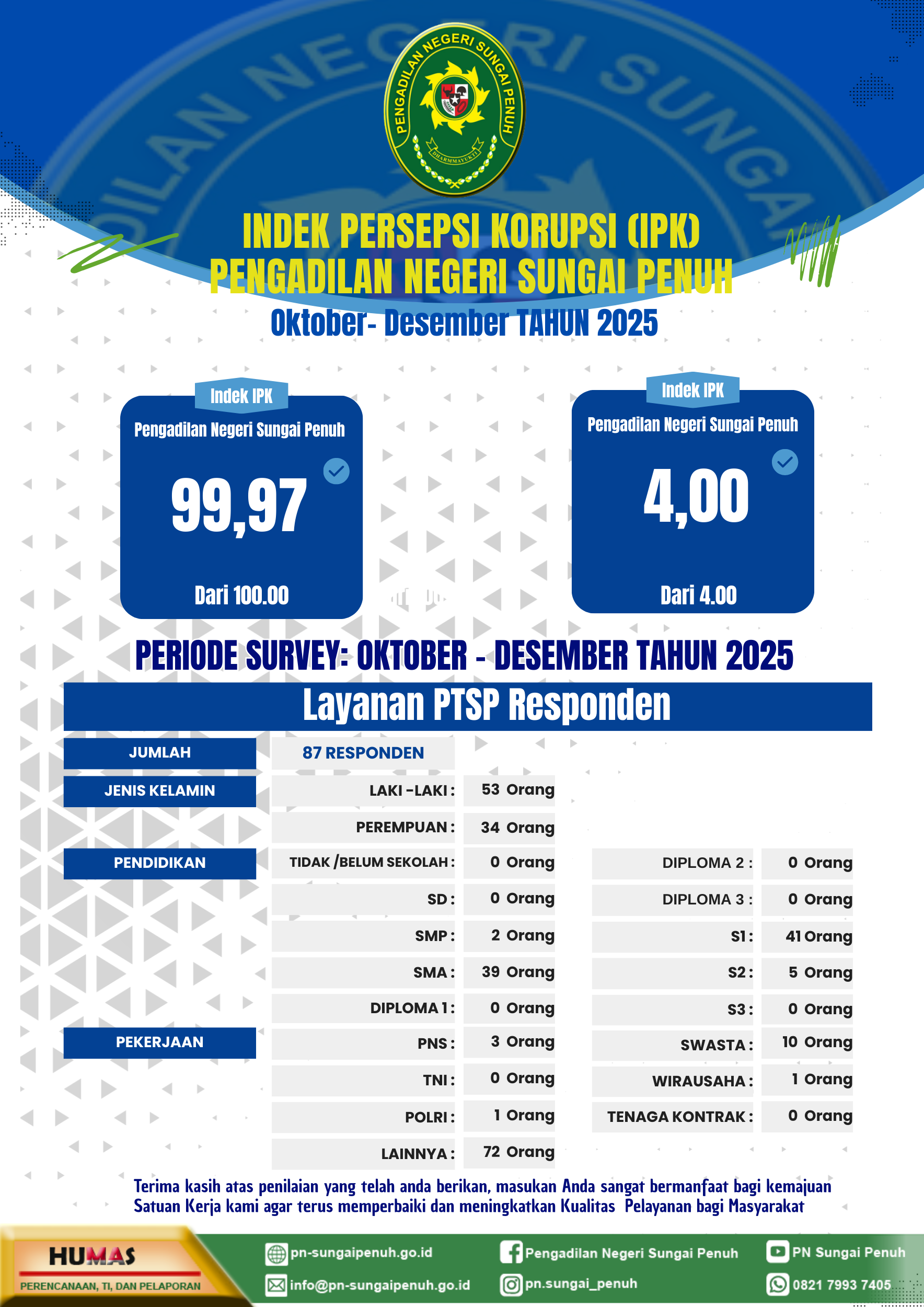 Publik berhak dan dapat menyampaikan persepsi kepuasan masyarakat terhadap pelayanan publik Pengadilan Negeri Sungai Penuh
